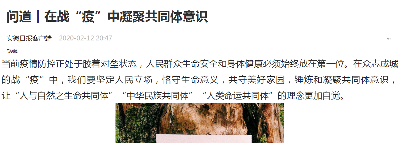 编者按:在当前抗击疫情关键阶段,我们要坚定人民立场,恪守生命意义,共守美好家园,锤炼和凝聚共同体意识,让“人与自然之生命共同体”“中华民族共同体”“人类命运共同体”的理念更加自觉。2月12日,安徽日报发表了我校马克思主义学院教师马晓燕的文章《在战“疫”中凝聚共同体意识》,学习强国平台也进行了转载报道。