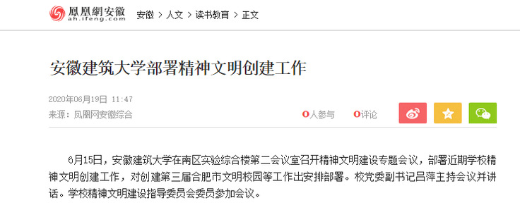 编者按:6月15日,我校召开精神文明创建工作会议,对创建第三届合肥市文明校园等工作出安排部署。6月19日,凤凰网安徽对此进行了报道。