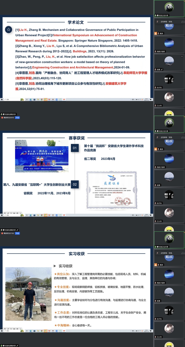 土木水利专业的彭鹏从检索与阅读文献、论文的选题与构思、撰写论文的规范到论文的投稿与刊发四个方面详细的为研子们介绍了一篇高质量论文的产出过程;土木水利专业的刘浩详细介绍了他在学业成绩、综合素质、科研成果、创新实践四个方面丰富的实践经历,展示了其在学科竞赛和学术发表方面所获的成果,最后还为研子们特别介绍了其在实习过程中所获得的丰富经验和心得体会。