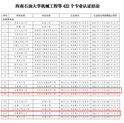 本网讯 近日,根据中国工程教育专业认证协会、教育部高等教育教学评估中心《关于公布西南石油大学机械工程等422个专业认证结论的通知》(工认协〔2022〕21号),我校环境工程和无机非金属材料工程2个专业均以“有效期6年(2022年1月-2027年12月)”的结论通过国家工程教育专业认证。其中,环境工程专业为首次通过国家工程教育专业认证。